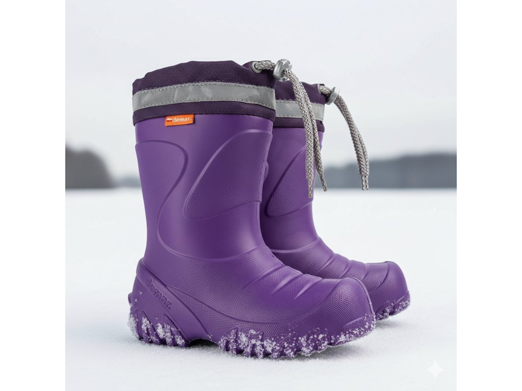 Dětské stahovací zateplené holínky Demar MAMMUT S jsou pravděpodobně nejlehčí a nejteplejší holínky na trhu. Barva gumáků je fialová. Holínky jsou vyrobeny z mrazuvzdorného kopolymeru EVA v kombinaci s vyjímatelnou vložkou z ovčí vlny, díky které jsou velice pohodlné a teplé. Na horní části je umístěn nástavec se stahovákem na tkaničku a reflexní prvek. Gumáky poskytují vynikající uživatelský komfort i při nízkých teplotách.