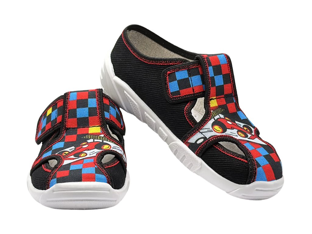 Dětské bačkory Bighorn ALEX v černé barvě s barevnými kostkami a motivem formule na špičce. Svrchní část obuvi je vyrobena z vysoce kvalitní bavlny a podešev obuvi z PVC. Stélka bačkor je z přírodní kůže, která je na spodní straně doplněna pružnou pěnou s aktivním uhlím. Díky této kombinaci dochází k odstraňování přebytečné vlhkosti a absorpci nepříjemných pachů. Pro lepší uživatelský komfort je pata bot vyztužena. Pohodlné obouvání bačkor je zajištěno suchým zipem. Celkově jsou boty velice pohodlné a uživatelsky přívětivé.