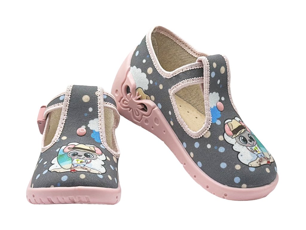 Dětské bačkory Bighorn BERTA v šedé barvě s barevnými puntíky a motivem myšky na špičce. Svrchní část obuvi je vyrobena z vysoce kvalitní bavlny a podešev obuvi z PVC. Stélka bačkor je z přírodní kůže, která je na spodní straně doplněna pružnou pěnou s aktivním uhlím. Díky této kombinaci dochází k odstraňování přebytečné vlhkosti a absorpci nepříjemných pachů. Pro lepší uživatelský komfort je pata bot vyztužena. Pohodlné obouvání bačkor je zajištěno přezkou. Celkově jsou boty velice pohodlné a uživatelsky přívětivé.