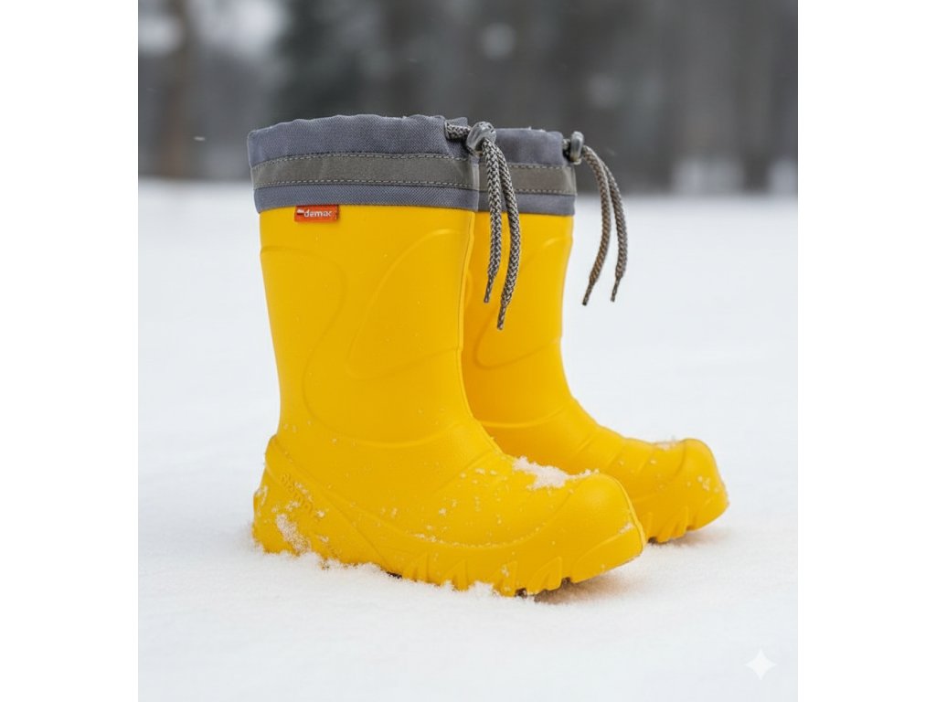 Dětské stahovací zateplené holínky Demar MAMMUT S jsou pravděpodobně nejlehčí a nejteplejší holínky na trhu. Barva gumáků je žlutá. Holínky jsou vyrobeny z mrazuvzdorného kopolymeru EVA v kombinaci s vyjímatelnou vložkou z ovčí vlny, díky které jsou velice pohodlné a teplé. Na horní části je umístěn nástavec se stahovákem na tkaničku a reflexní prvek. Gumáky poskytují vynikající uživatelský komfort i při nízkých teplotách.