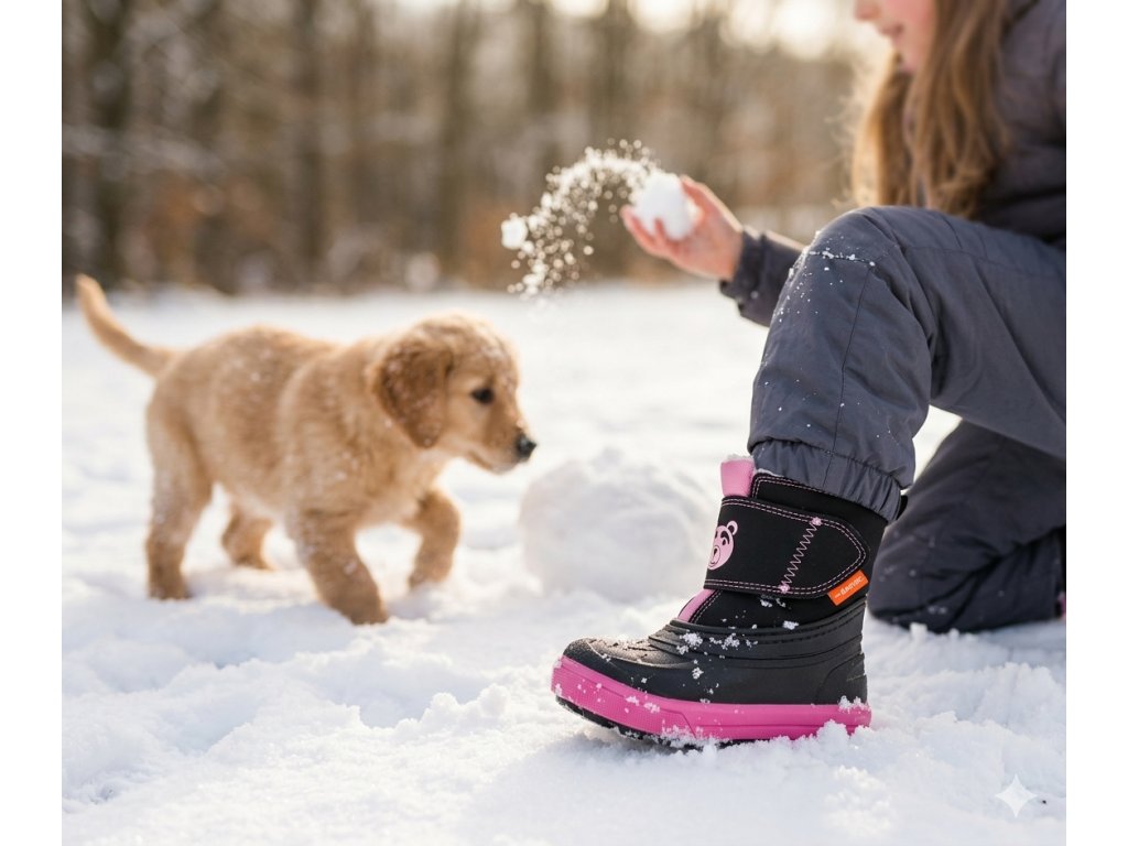 Dětské zimní sněhule Demar BEAR jsou ideální volbou do chladného počasí. Barva obuvi je černorůžová. Svrchní část sněhulí je vyrobena z odolného a lehce omyvatelného syntetického materiálu a spodní nepromokavá část z mrazuvzdorného termokaučuku. Boty jsou zatepleny kožíškem z ovčí vlny, díky kterému jsou velice pohodlné a teplé. Pro pohodlné obouvání a jednoduché zapínání jsou sněhule vybaveny suchým zipem. Na svršku obuvi je umístěn reflexní prvek. Boty mají hrubší vzorek podrážky, který přispívá k bezpečnosti chůze.