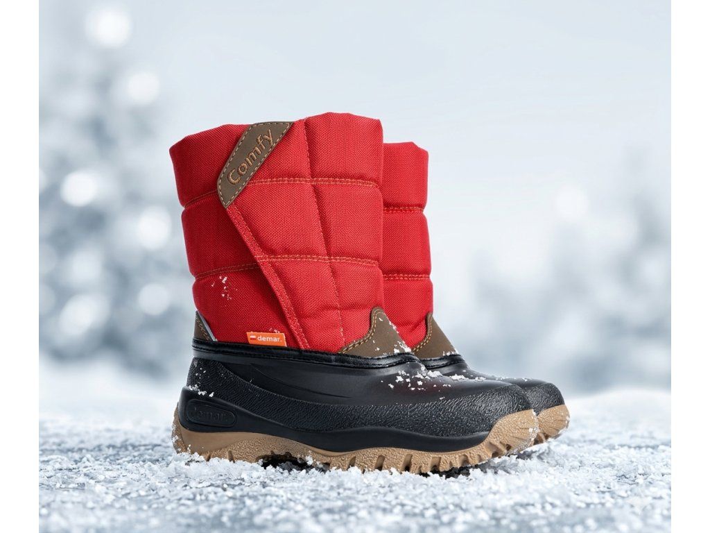 Dětské zimní sněhule Demar COMFY jsou ideální volbou do chladného počasí. Barva obuvi je červená. Svrchní část sněhulí je vyrobena z odolné a lehce omyvatelné textilie a spodní nepromokavá část z mrazuvzdorného termokaučuku. Boty jsou zatepleny vyjímatelnou vložkou s kožíškem z ovčí vlny, díky kterému jsou velice pohodlné a teplé. Pro pohodlné obouvání a jednoduché zapínání jsou sněhule vybaveny suchým zipem. Na svršku obuvi je umístěn reflexní prvek. Boty mají hrubší vzorek podrážky, který přispívá k bezpečnosti chůze.